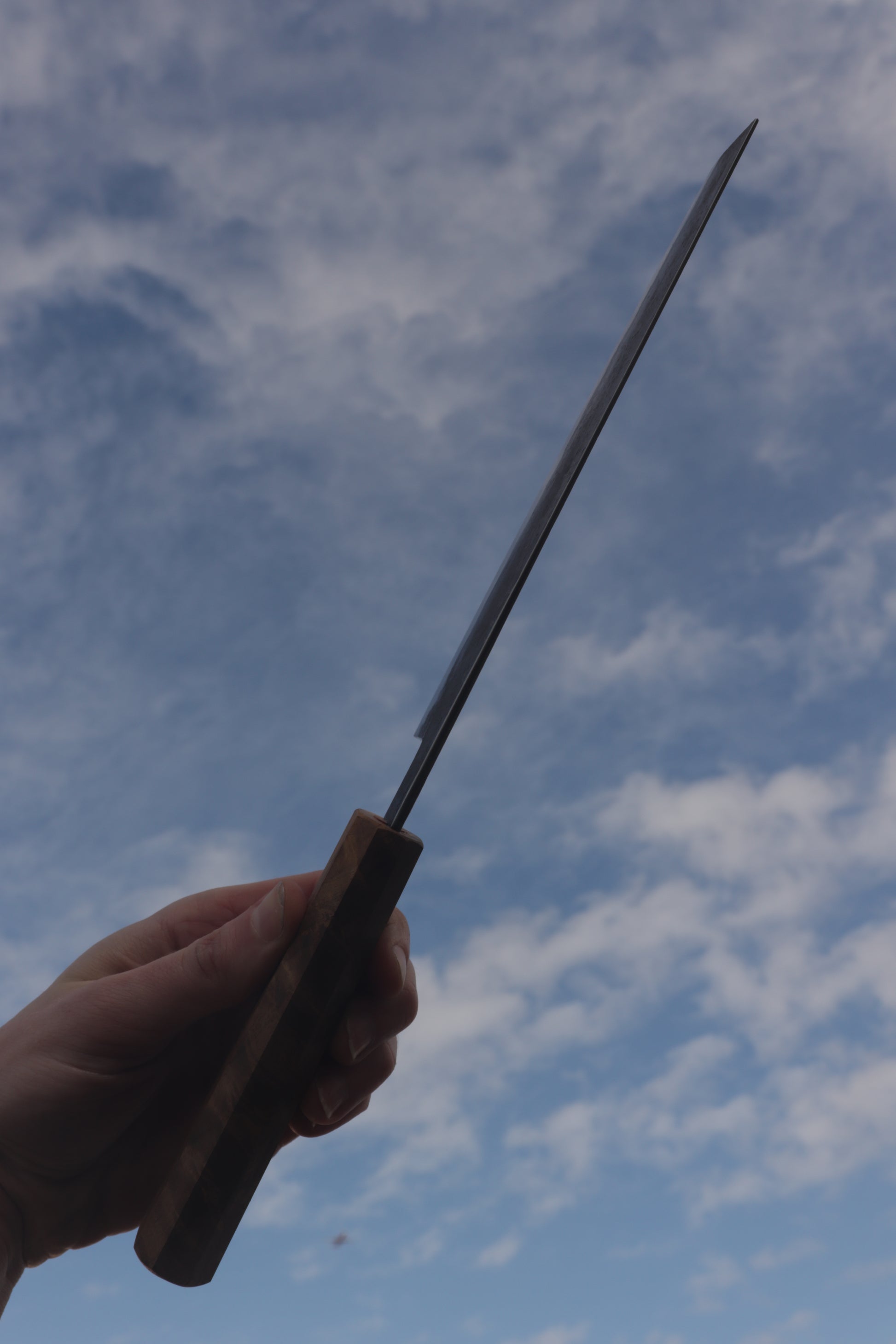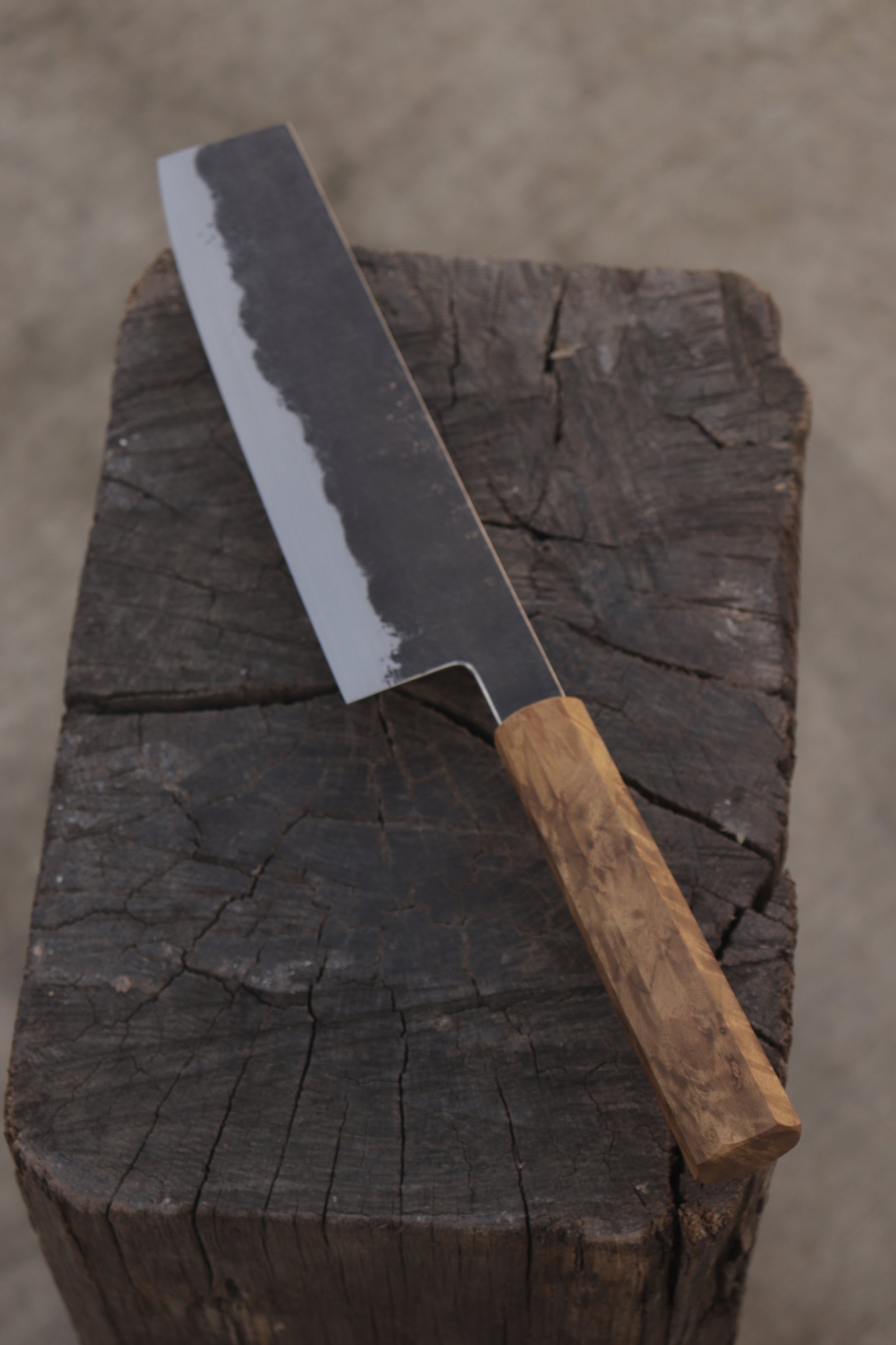 Hand forged stainless steel with an ultra thin grind makes vegetables quake in its presence. The nakiri is a champion of leafy greens and root vegetables alike traditionally being described as a "vegetable cleaver." I of course put my own twist on it. I pushed the geometry to extremes to make this knife a top performer and slightly modified the profile to make it a bit more useful and carry its weight as a tool in your knife roll. This nakiri has an established tip to handle some more delicate cutting tasks along side the usual chopping and push cutting. Truly a performer.