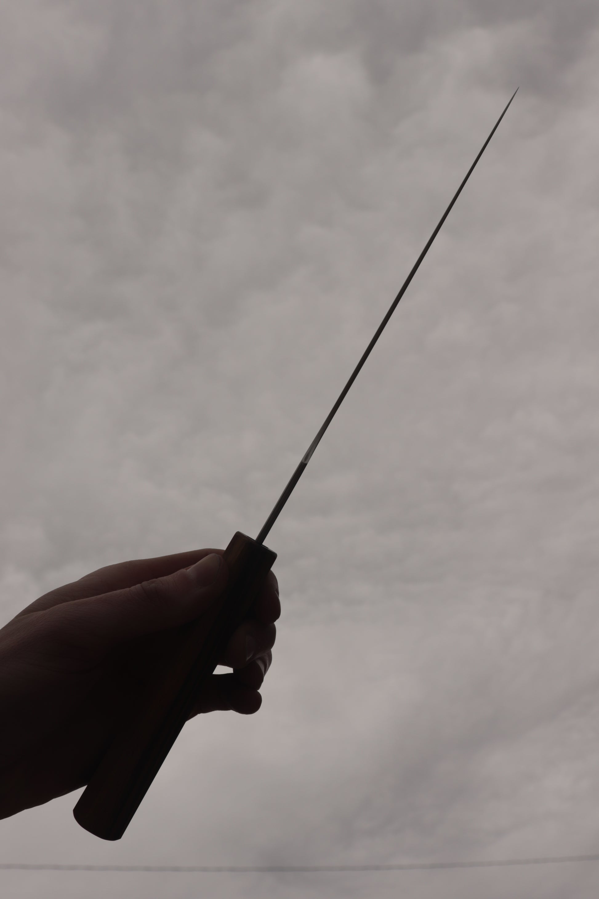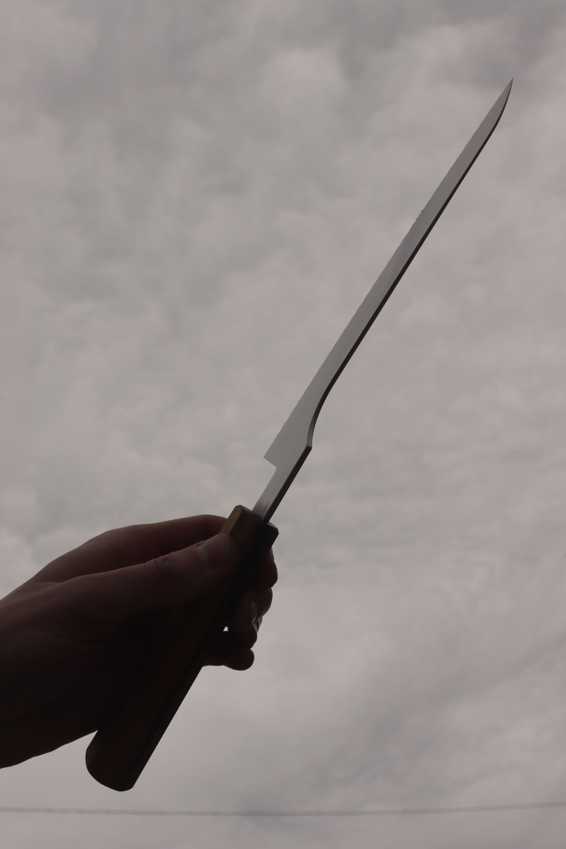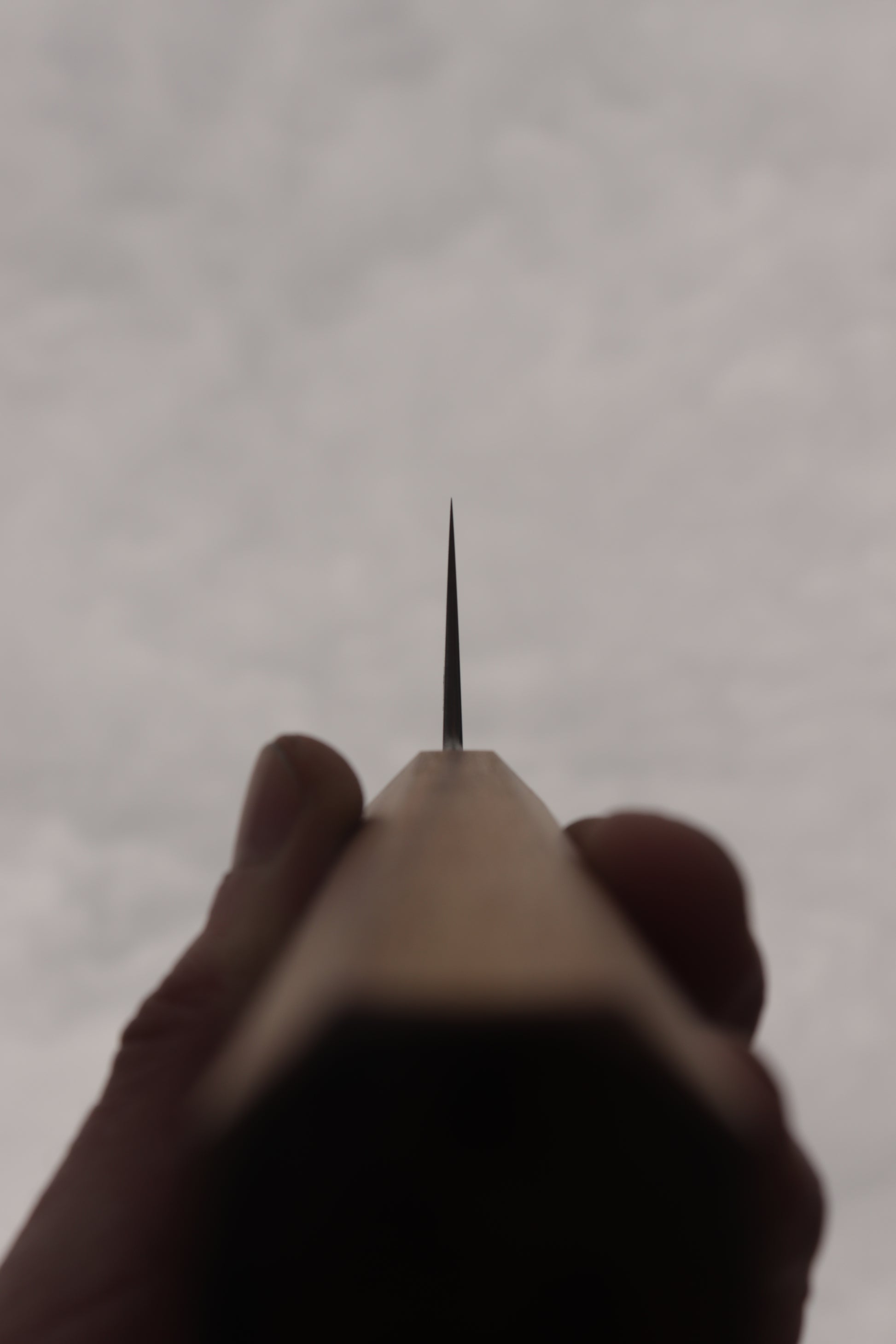 Keep your knuckles off the cutting board! The no.8 offset serrated was created to give chefs and home cooks a versatile utility knife that can tackle a multitude of tasks. The size and spacing of the serrations was developed to handle both hard crust and soft crusted breads. The edge is ground thin before serrations were cut so it doesn't wander off your cutting line like most bread knives. This geometry also excels at cutting tomatoes and other veggies which was a non-negotiable for the chefs that helped me hone in this design. A dark horse for your knife roll and an invaluable tool for its utility.