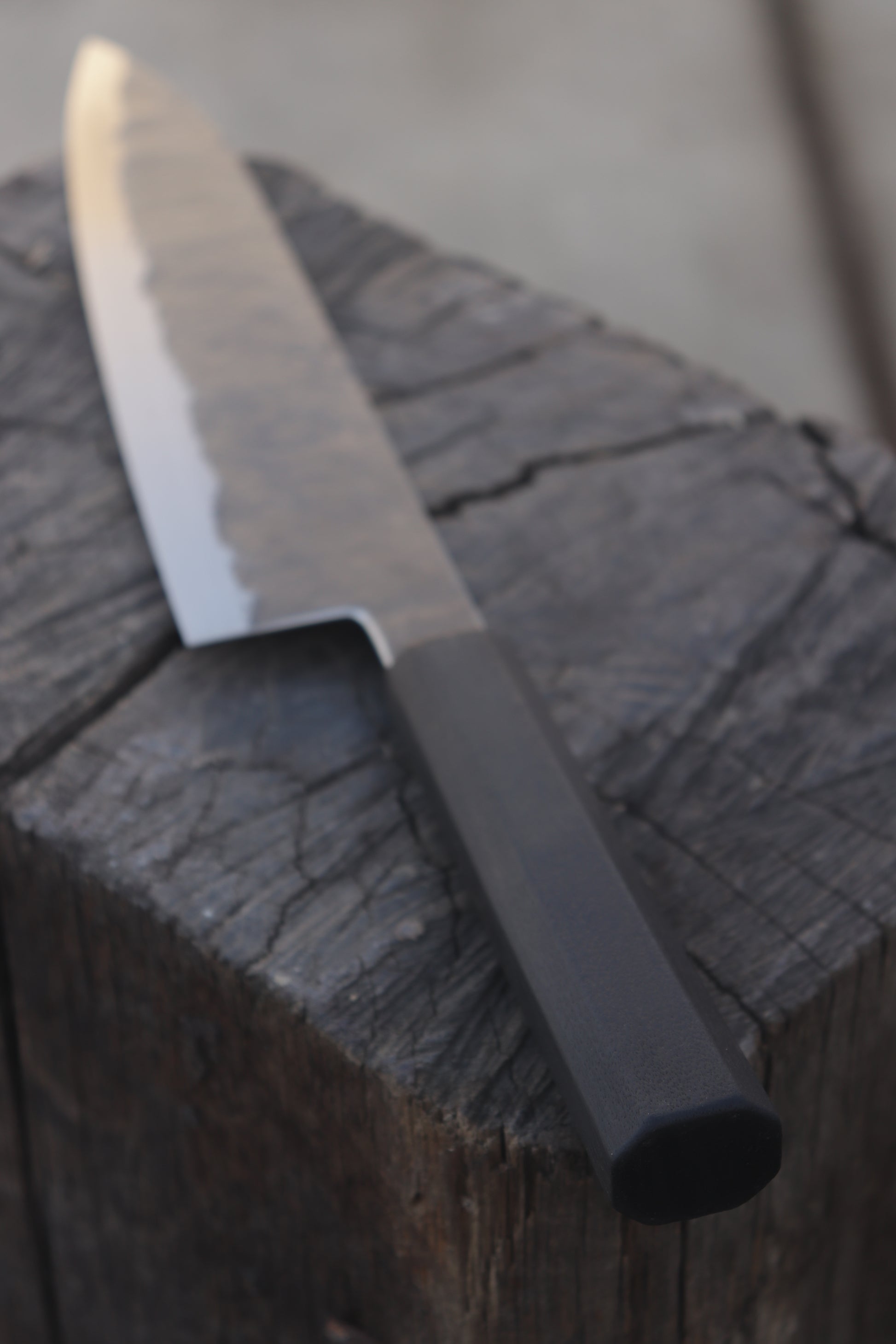 Hand forged stainless steel and charred Oregon myrtle. A dark horse among its ilk. With a 9.5" blade this knife can handle anything you can throw at it while still being light enough you can wield it with total confidence. The laser thin grind cuts like butter while the ever so slightly forward weighted blade asks to be pushed through ingredients.